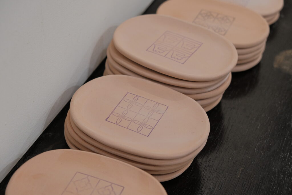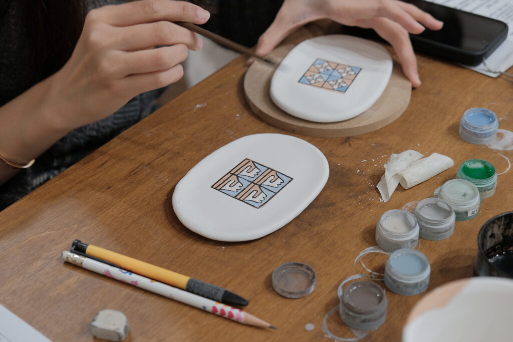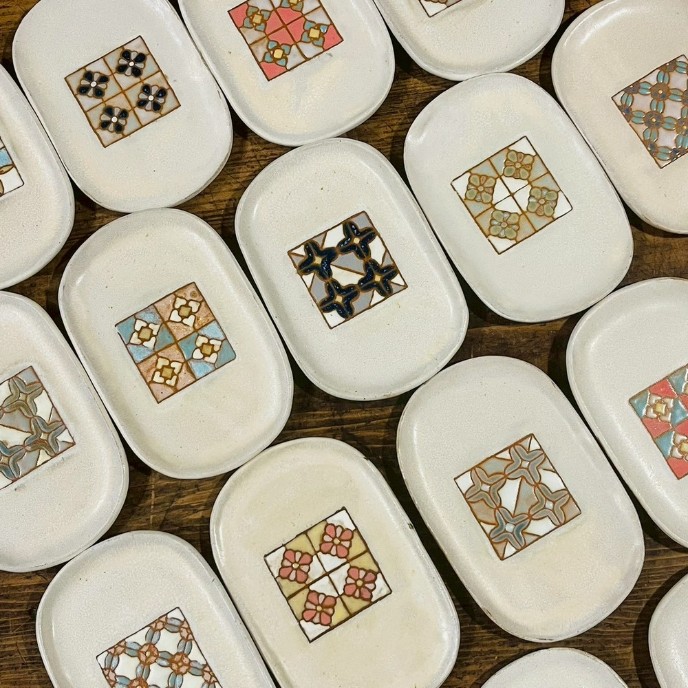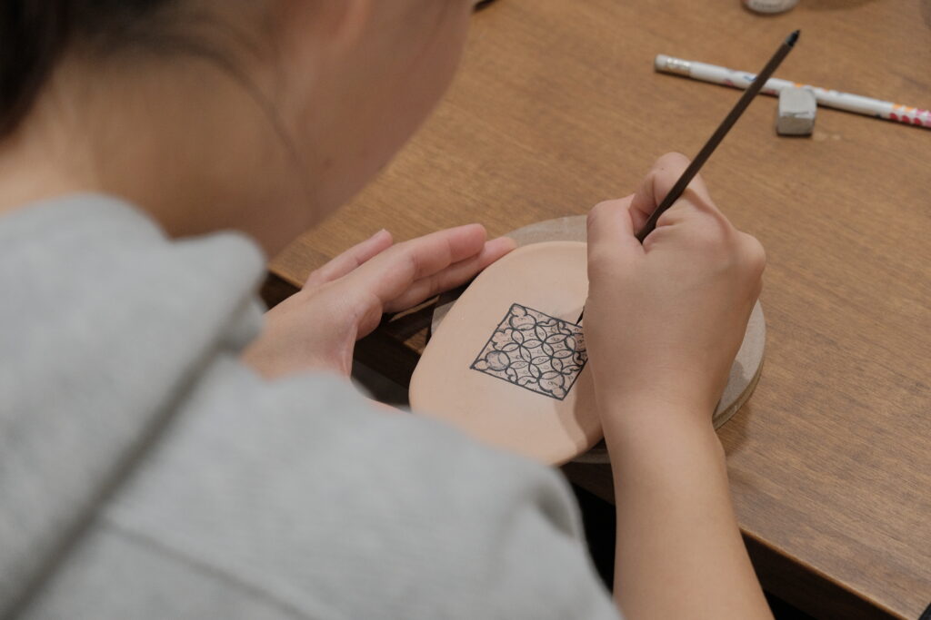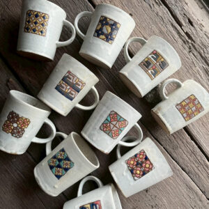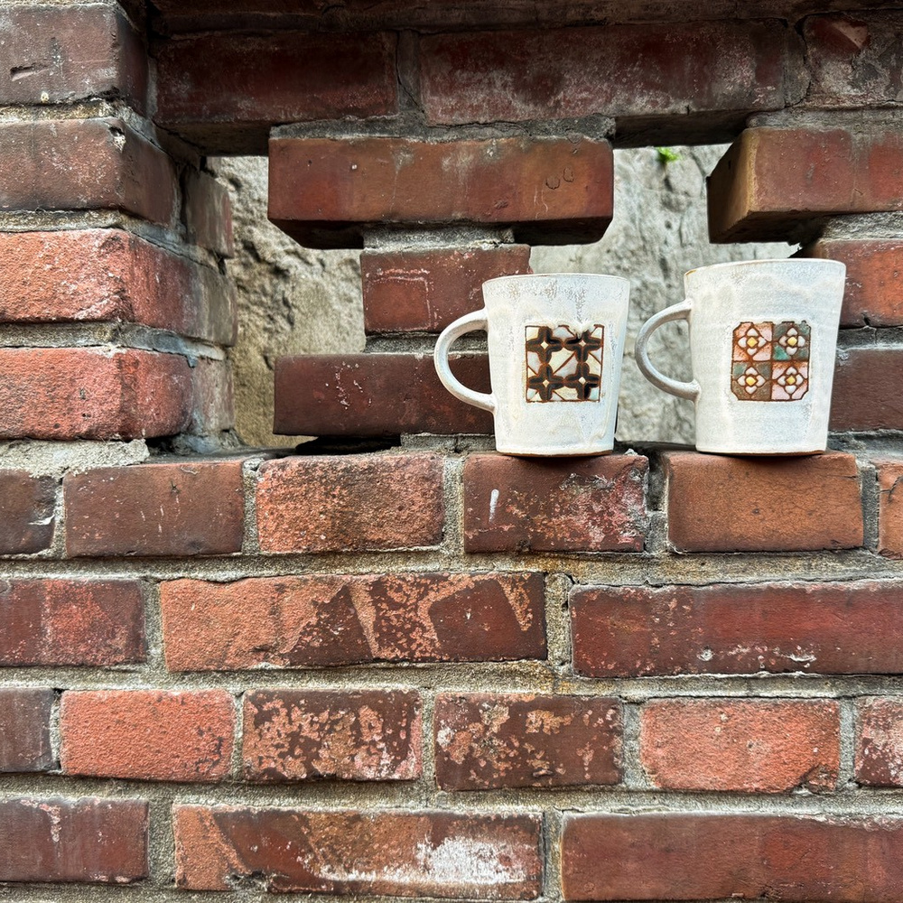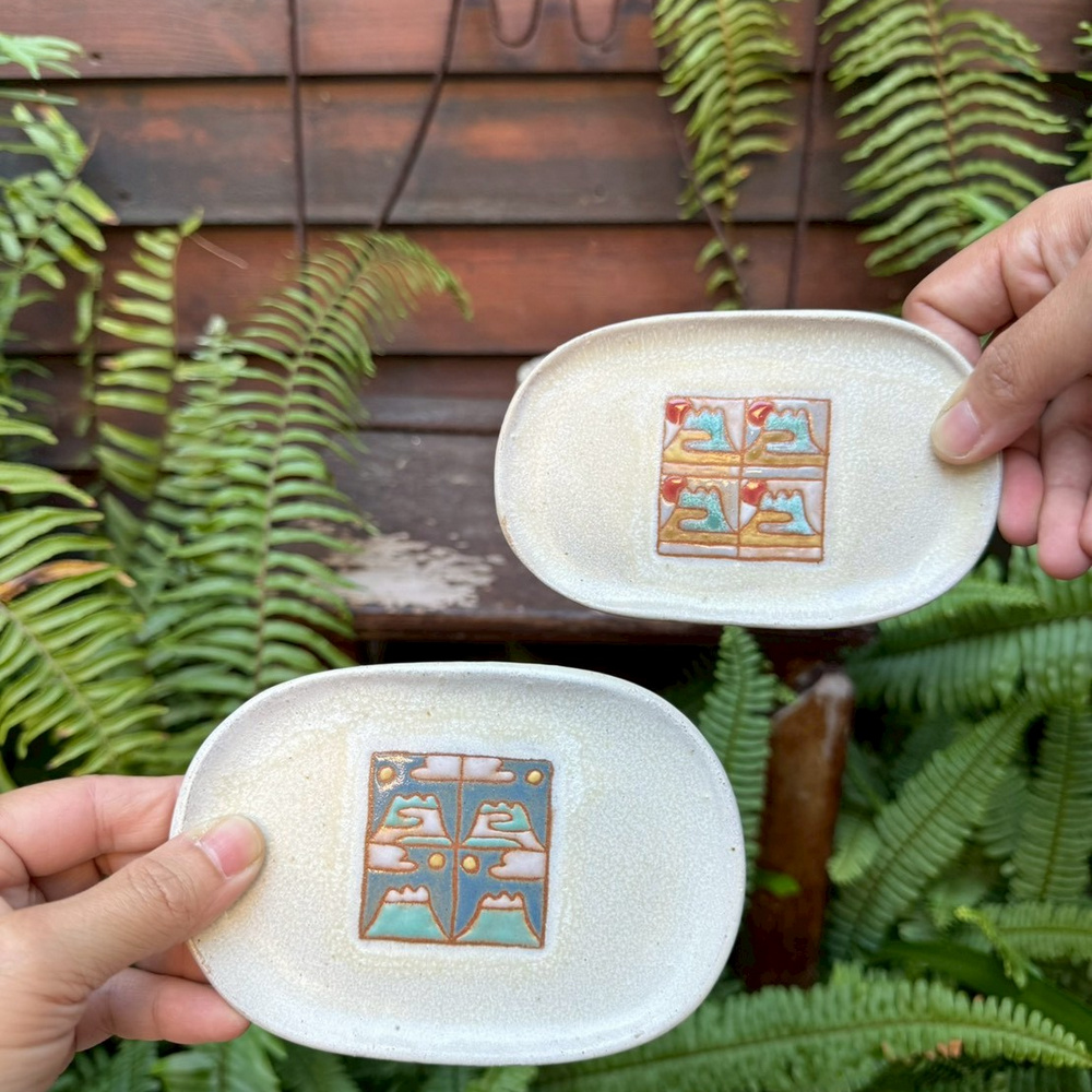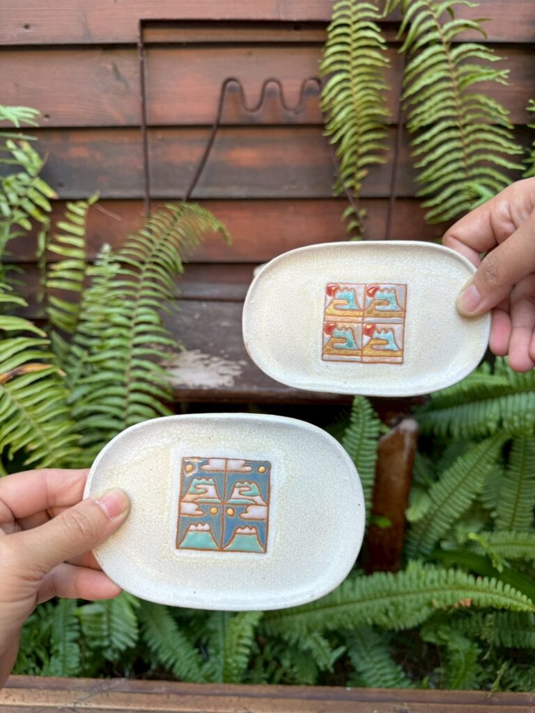 而力野茶陶所的兩位創辦人,研究了將釉彩變得立體的方法,讓各位可以在杯盤上用釉藥彩繪出可愛、微立體的花磚圖樣,將這些小時候的生活記憶重新帶回日常中。