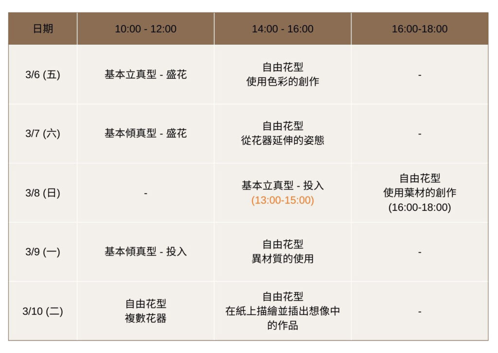 | 班別 | ■ (基本)立真盛花.3/6,10:00-12:00, ■ 使用色彩的創作.3/6,14:00-16:00, ■ (基本)傾真盛花.3/7,10:00-12:00, ■ 從花器延伸的姿態.3/7,14:00-16:00, ■ (基本)立真投入花.3/8,13:00-15:00, ■ 使用葉材的創作.3/8,16:00-18:00, ■ (基本)傾真投入花.3/9,10:00-12:00, ■ 異材質的使用.3/9,14:00-16:00, ■ 複數花器.3/10,10:00-12:00, ■ 在紙上描繪並插出想像中的作品.3/10,14:00-16:00 |