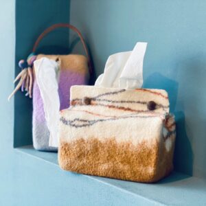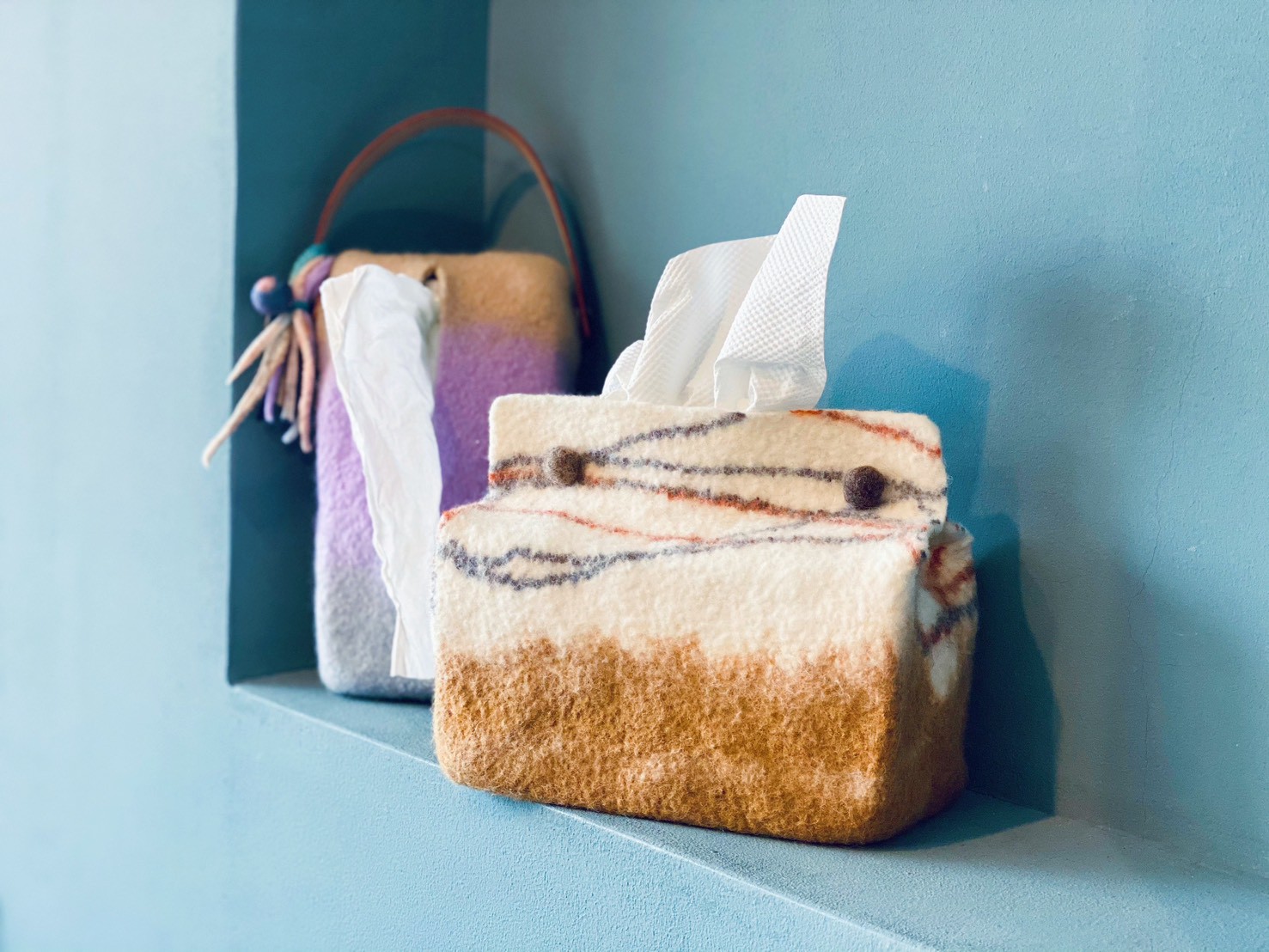 濕氈創作的面紙盒,輕巧實用,但在視覺上又很有份量感,是生活空間中兼具美感的存在。