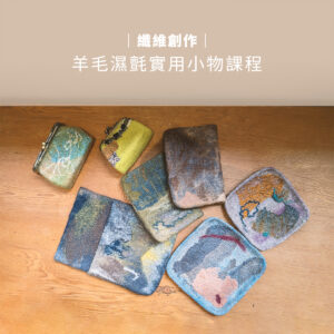 在此系列課程中,老師將帶各位從一撮撮的羊毛開始,一步一步,學會讓它長出形體與功能。製作出實用的杯墊、書套、平板套、口金包、面紙盒等物件。
