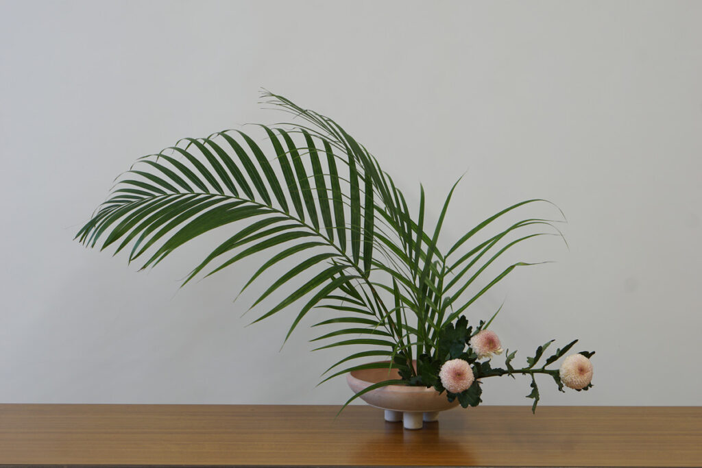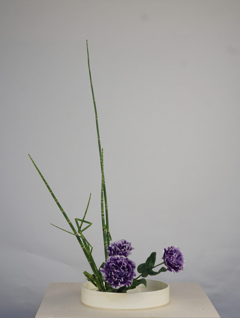 最長的主枝傾斜延伸。這個花型表達花材流動的動態。當使用淺盤花器時,這個風格會將觀者的注意力引導到水面。它體現了一種輕盈而柔和的氛圍。