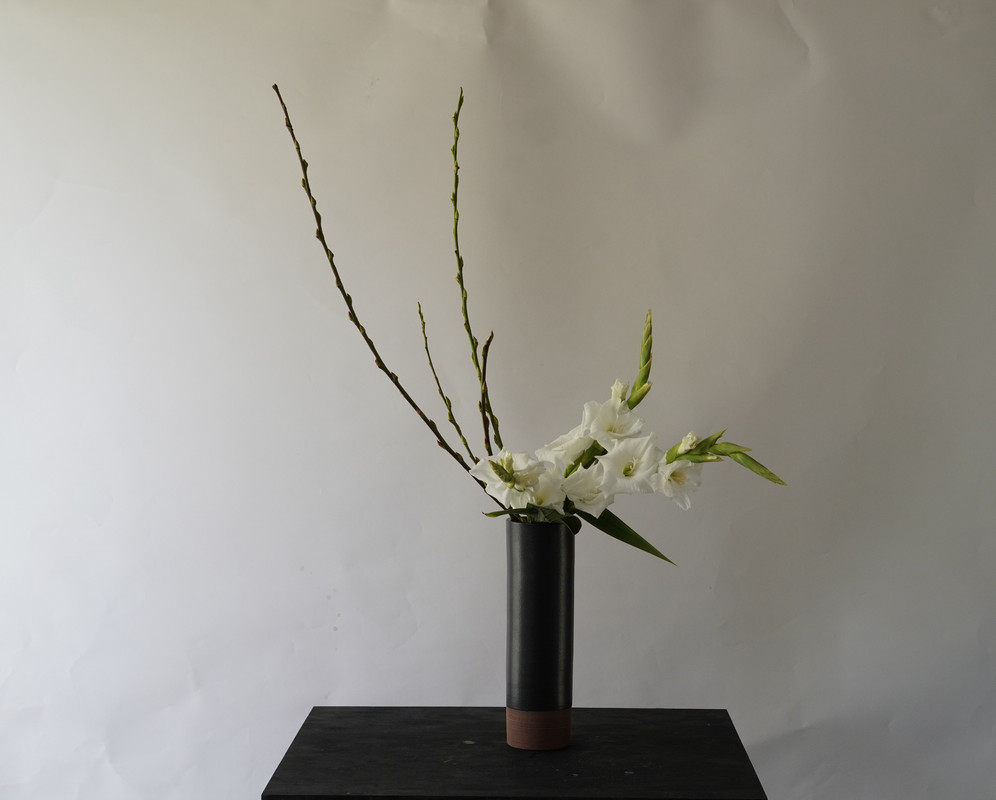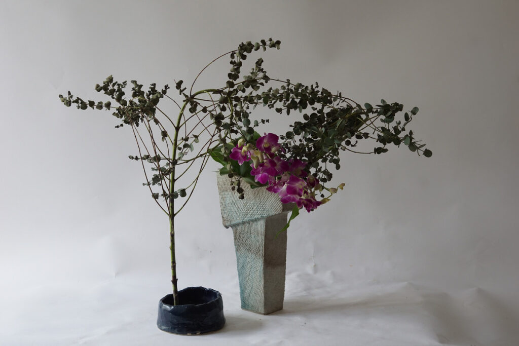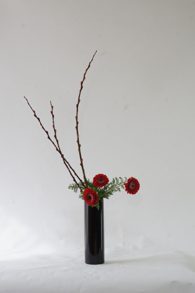在本課程中,我們將以投入式的形式來呈現同樣的基本直立式。由於投入式不使用劍山,固定花材需要特定的技巧。這個風格我們將學習垂直固定法。