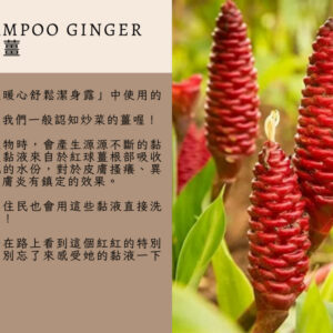 成分中使用的紅球薑(shampoo ginger)生長在東南亞地區一代,其紅色的球莖擠壓後會產生許多汁液,這些汁液可以當天然的洗髮精,同時也對於過敏肌膚有很好的舒緩,是天然抗過敏的植物。
