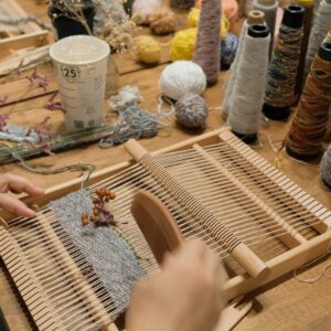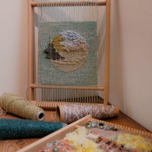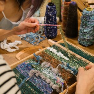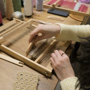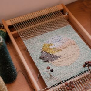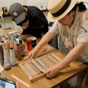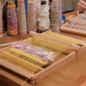 將不同的線材在小織框中穿梭,玩味顏色的排列、或粗或細的纖維交錯樂趣,