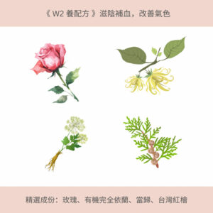 W2養配方蘊含滋陰的玫瑰及完全依蘭,再加入當歸、台灣紅檜等,達到補血、補氣、理氣,相輔相成的效果。用於生理期第二週(生理期來臨為第一天,即第7-14天),或作日常女性身心保養。​