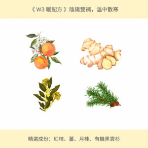 第三週 (W3) 我們需要陰陽雙補、排寒暖宮。W3暖配方以黑雲杉為基底,加上薑和月桂等東方草藥,能排寒暖宮、温中散寒。再輔以紅桔等加強了行氣去寒濕及預防水腫。用於生理期第三週(生理期來臨為第一天,即第14-21天),或適合虛寒體質作日常調養。