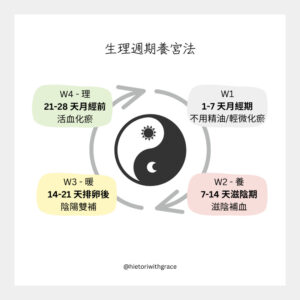 在女性生理週期的不同階段,有時血虛,需要補血(不能強補氣);有時陰陽消長,需要氣血雙補;有時需要化瘀;有時需要讓身體自行運作,暫緩調養。每個時期所有注意的重點不同,對症處理才能有效調理身體狀態。
